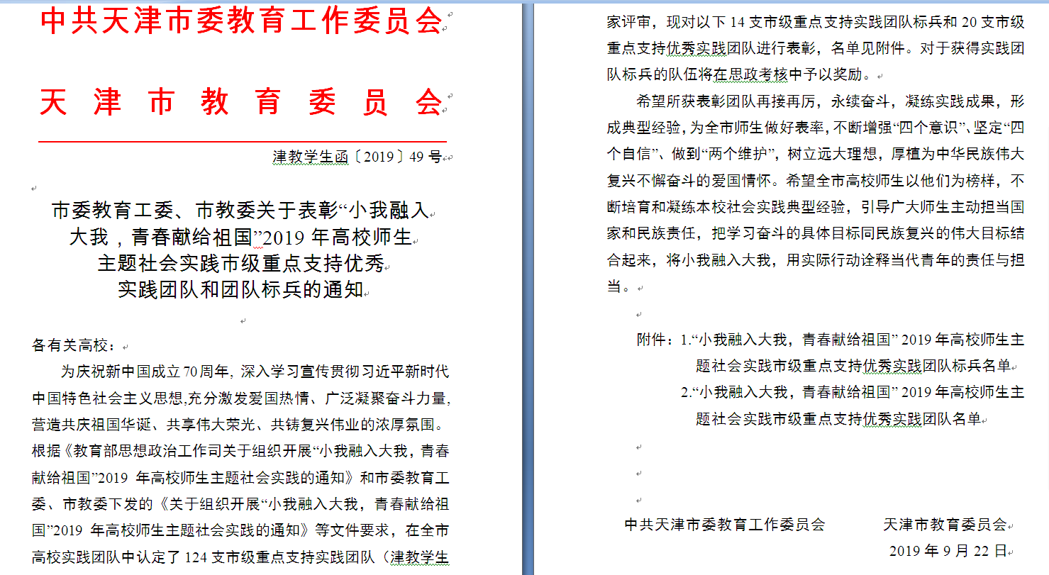 为庆祝新中国成立70周年,深入学习宣传贯彻习近平新时代中国特色社会主义思想,充分激发爱国热情,广泛凝聚奋斗力量,营造共庆祖国华诞、共享伟大荣光、共铸复兴伟业的浓厚氛围,教育部、市教工委及市教委组织开展“小我融入大我,青春献给祖国”2019年高校师生主题社会实践活动,beat365青年志愿者协会“红星照耀新青年”社会实践团荣获2019年高校师生主题社会实践市级重点支持优秀实践团队。