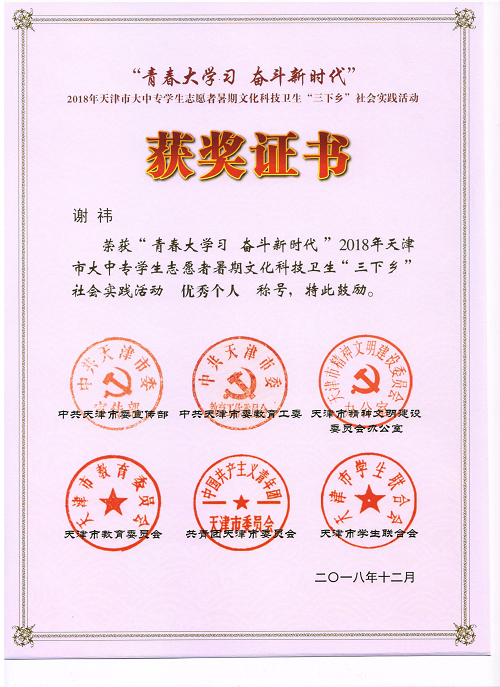 beat365在此次社会实践活动中荣获“2018年天津市大中专学生志愿者暑期社会实践活动优秀组织单位”称号,学生实践团“英国beat365官方网站新时代筑梦联盟”荣获“2018年天津市大中专学生志愿者暑期社会实践活动优秀团队”称号,马雨晴、谢祎、项明青,三位学生荣获“2018年天津市大中专学生志愿者暑期社会实践活动先进个人”称号。